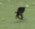 Het regent als ik richting he ontbijt loop, dat voorspelt niet veel goeds voor vandaag. Er staat namelijk een lange wandeling op het programma in de Barskoon vallei en dat is niet bepaald lekker met regen. Na het ontbijt is het weliswaar droog, maar het blijft dreigend. We rijden vandaag richting Djeti Oghuz en onze eerste stop is bij twee standbeelden van Yuri Gegarin. Blijkbaar heeft die ooit een vakantiehuis gehad hier in the-middle-of-nowhere. Daarna maken we een stop bij een supermarktje om wat in te slaan voor vanavond. Een stukje verder stappen we over in 2 kleine busjes, de grote bus gaat alvast verder naar ons volgende hotel. We krijgen eerst een show van een jager die arenden gebruikt. Eerst met een vossebontje waar de eerste adelaar weinig interesse in lijkt te hebben, de andere adelaar doet het beter. Het levende konijntje wordt wel direct in de kraag gevat. Maar dat was ook geen uitdaging, het stomme beest bleef stil zitten.