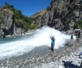 En dan gaan we echt op weg. In het begin nog wat onwennig maar even later gaan we al met gemak steile hellingen op en af, soms vol met grote losse stenen zodat je goed naar balans moet zoeken. We stoppen een paar keer om foto’s te maken onder andere boven op een berg met prachtig uitzicht waar we koffie met een koekje krijgen. We dalen helemaal af naar de Shotover rivier waar we ook door een diepe plas rijden, erg leuk. Bij de rivier zien we de speedboten langs komen die over het lage water door de bochten scheren, erg spectaculair. Jammer dat we daar geen tijd meer voor hebben. Hier zie ik ook dat mijn GPS tracker helaas niet aan stond dus vastlegging van de route is maar heel beperkt. De tour zit er weer op, aan het eind probeer ik nog een stukje tijdens het rijden te filmen met mijn action camera maar dat lukt helaas niet.