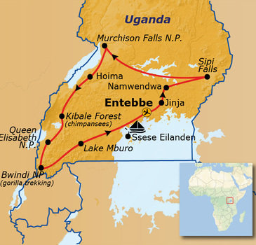 De reis begint in Entebbe, de hoofdstad van Uganda aan het Victoriameer. Dan door naar Jinja, waar ik ook de optionele excursie naar Ngamba eiland en het Jane Goodall Instituut geboekt heb. Vervolgens naar het platteland waar we in Namwenda overnachten op kampeerterrein bij een lokale school. De volgende dag verder naar Sipi Falls, een plek waar weinig toeristen komen en je blijkbaar mooie wandelingen langs watervallen kan maken. De volgende bestemming is Murchison Falls National Park aan de westkant van Uganda waar er ook gamedrives gepland staan. Via Hoima, waar we maar 1 nacht verblijven, gaan we door naar Kibale Forest National Park. Dit is DE plek voor een avontuurlijke chimpanseetrekking waarvoor ik ook alvast de permit besteld heb. Blijkbaar zijn er namelijk maar maximaal 36 per dag beschikbaar.