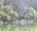 Ik had toch al een slechte nacht, door de honden die je continu hoort blaffen. Denk dat ik vannacht hooguit een uurtje of 3 echt geslapen heb. Na een prima ontbijt, waarbij de gebakken eitjes en pannekoeken in overvloed op de tafel worden gezet gaan we half 9 richting het Phou Hin Bun National Park. Daar worden de tickets geregeld en we lopen een stukje de grot in waar, in het halfduister, de opstapplaats is voor de bootjes. We stappen we in deze kleine langwerpige bootjes (3 per boot maar slechts 2 krijgen een lamp) die voorzien zijn van een soort buitenboordmotor met een schroef aan een lange stang. De bestuurder vaart ons verder de grot in de die hoofdlampen zijn hard nodig anders zou je geen hand voor ogen zien.