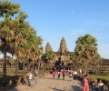Na de lunch gaan we naar Angkor Wat zelf, de beroemdste van de tempels hier. We hebben ruim 2 uur de tijd om hier rond te dolen, en dat was voldoende. Want eigenlijk viel het mij (en meerdere in mijn groep) een beetje tegen na Angkor Thom die veel mooier gedetailleerd is. Natuurlijk is het een prachtige tempel met 5 hoge pieken en ook best wel mooie reliëf uitsneden, maar veel minder dan de Bayon. Wel heel mooi is de foto die je kan maken met weerspiegeling in het water. Om 5 uur zijn we terug bij de karretjes en rijden we naar Pre Rup voor de zonsondergang. Ons was de bekendste plaats voor zonsondergang afgeraden omdat je daar al 2 uur vantevoren moet zijn om een goede plaats te bemachtigen, maar hier was het helemaal niks in mijn ogen. Vanaf deze tempel zag je alleen maar bos en ook nog een hoge boom precies in te pad van de ondergaande zon.